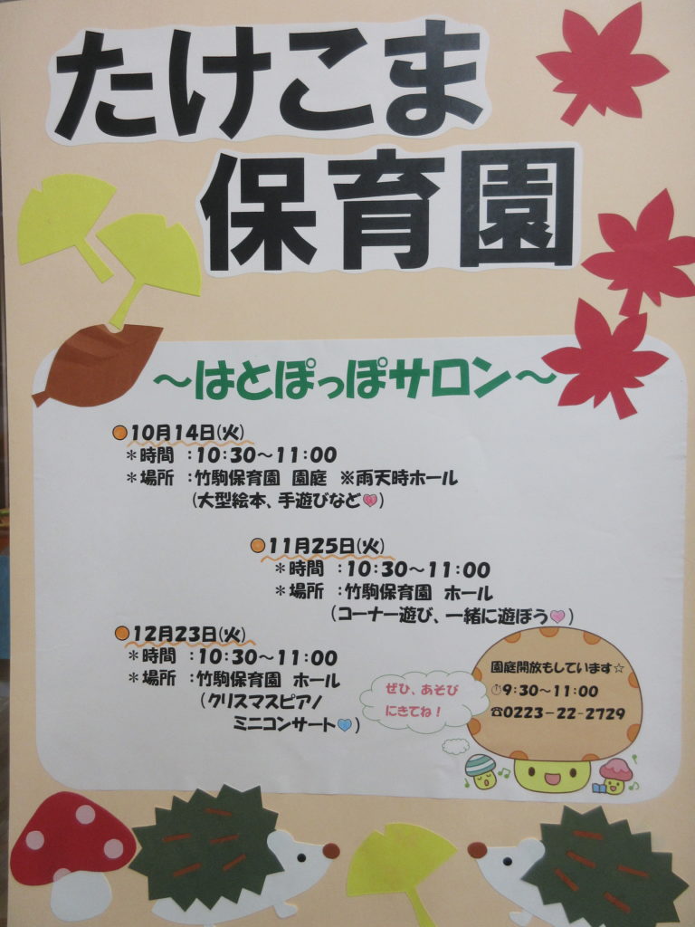 竹駒保育園のお楽しみイベント、はとぽっぽサロンも秋バージョンで、皆さんの参加をお待ちしています!